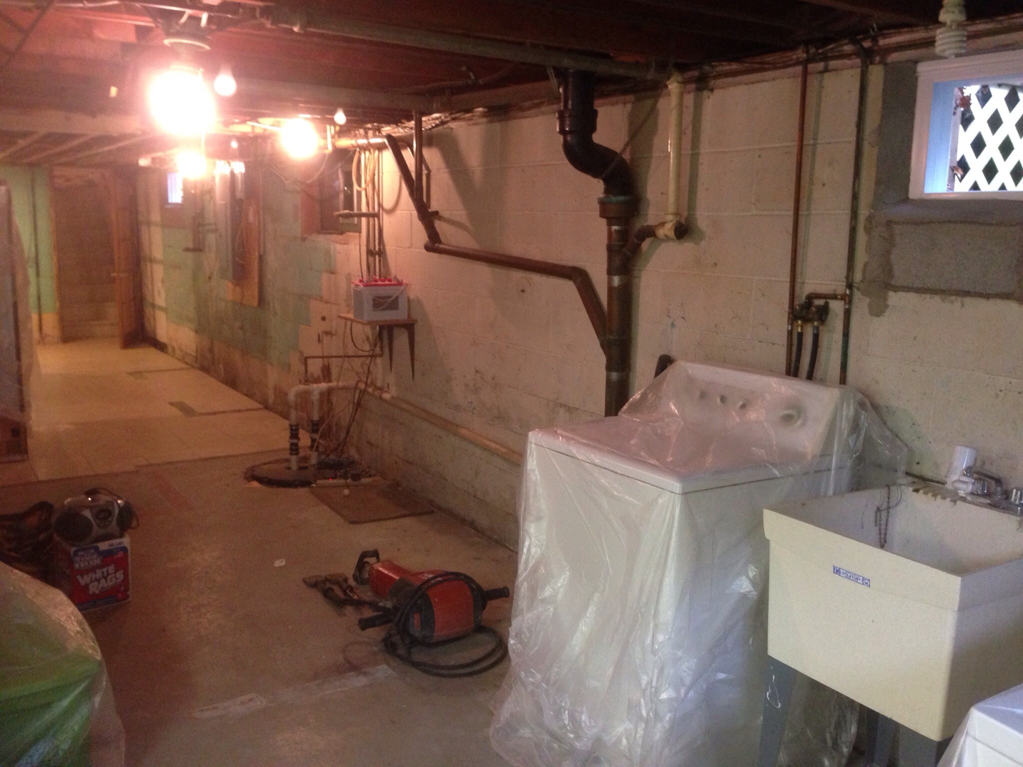 We installed (1) Pro Series 3033 Pump, (1) Strip of Grate Trench, 105 feet of Grate Drain, (2) Window Wells, 65 feet of Thermal Shield Vapor Barrier, 65 feet of Finish Shield Vapor Barrier, (1) Santa-Fe Classic Dehumidifier, and (1) Pro Series 2400 Battery Back Up Pump.