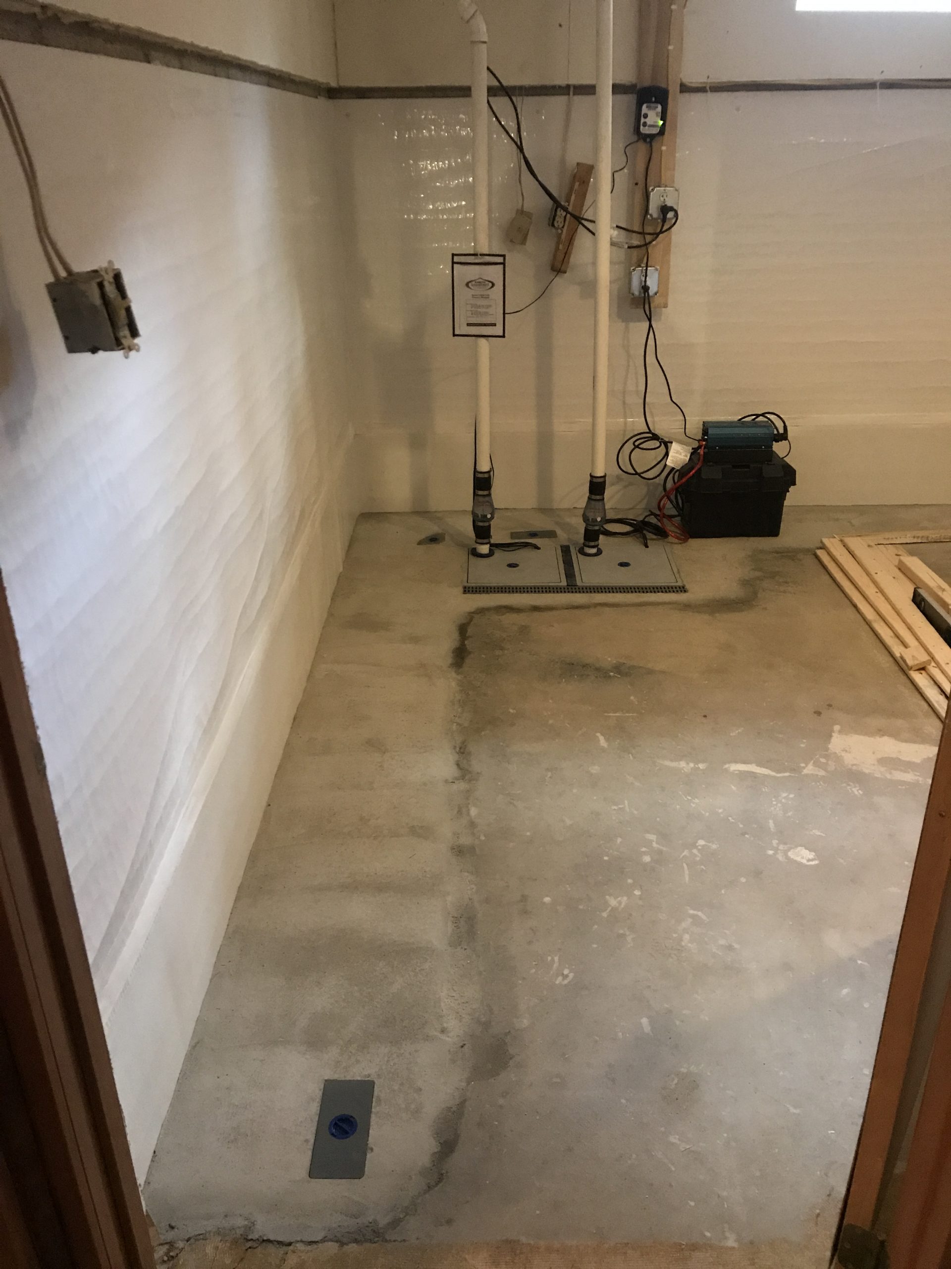 We installed (1) santa-fe advance dehumidifier, (2) grate sump liners, (1) strip of grate trench, (1) high water alarm, (2) fast sump pumps, (1) inverter, (1) battery, and 60 feet of grate drain along with 60 feet of thermalshield.